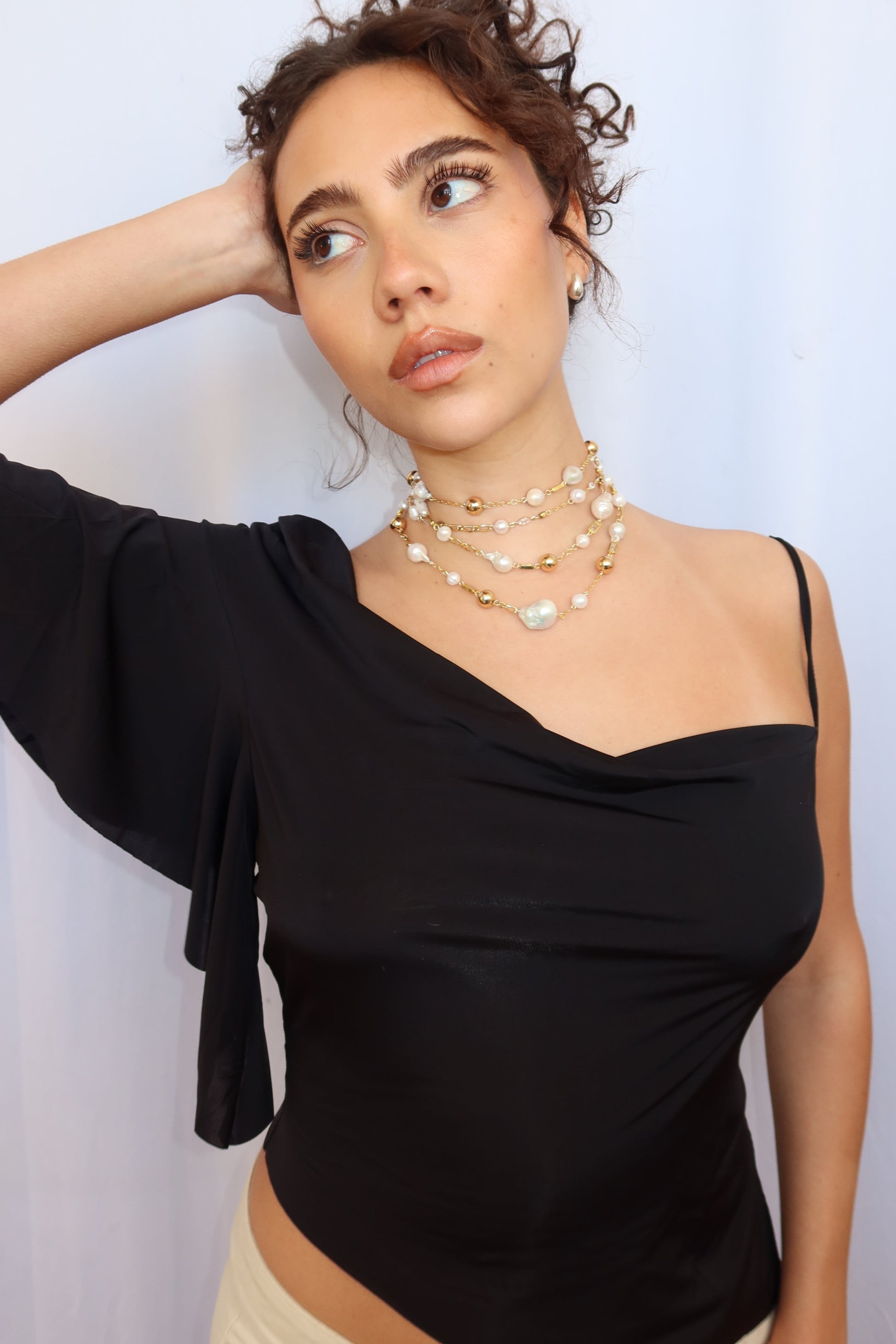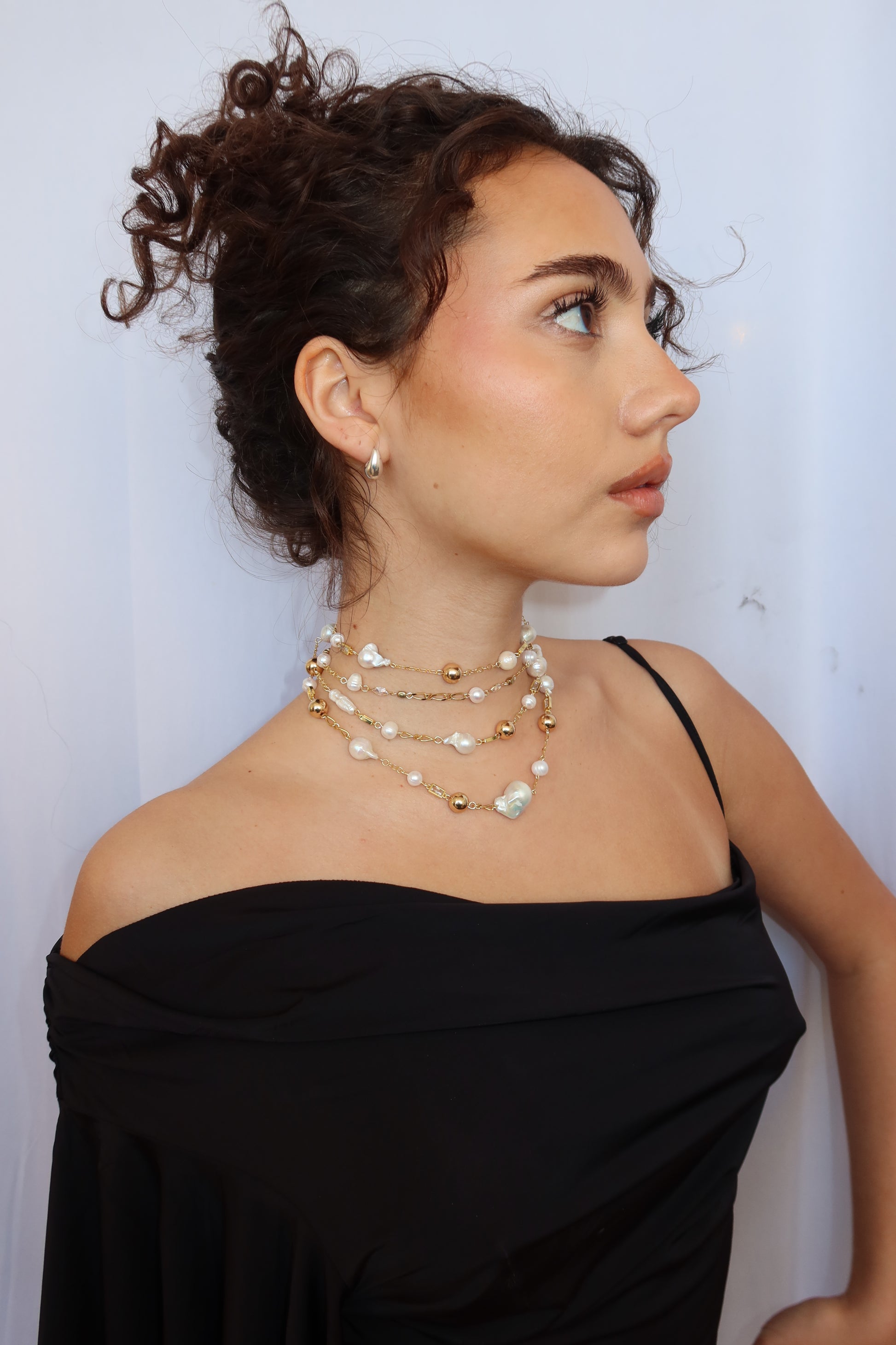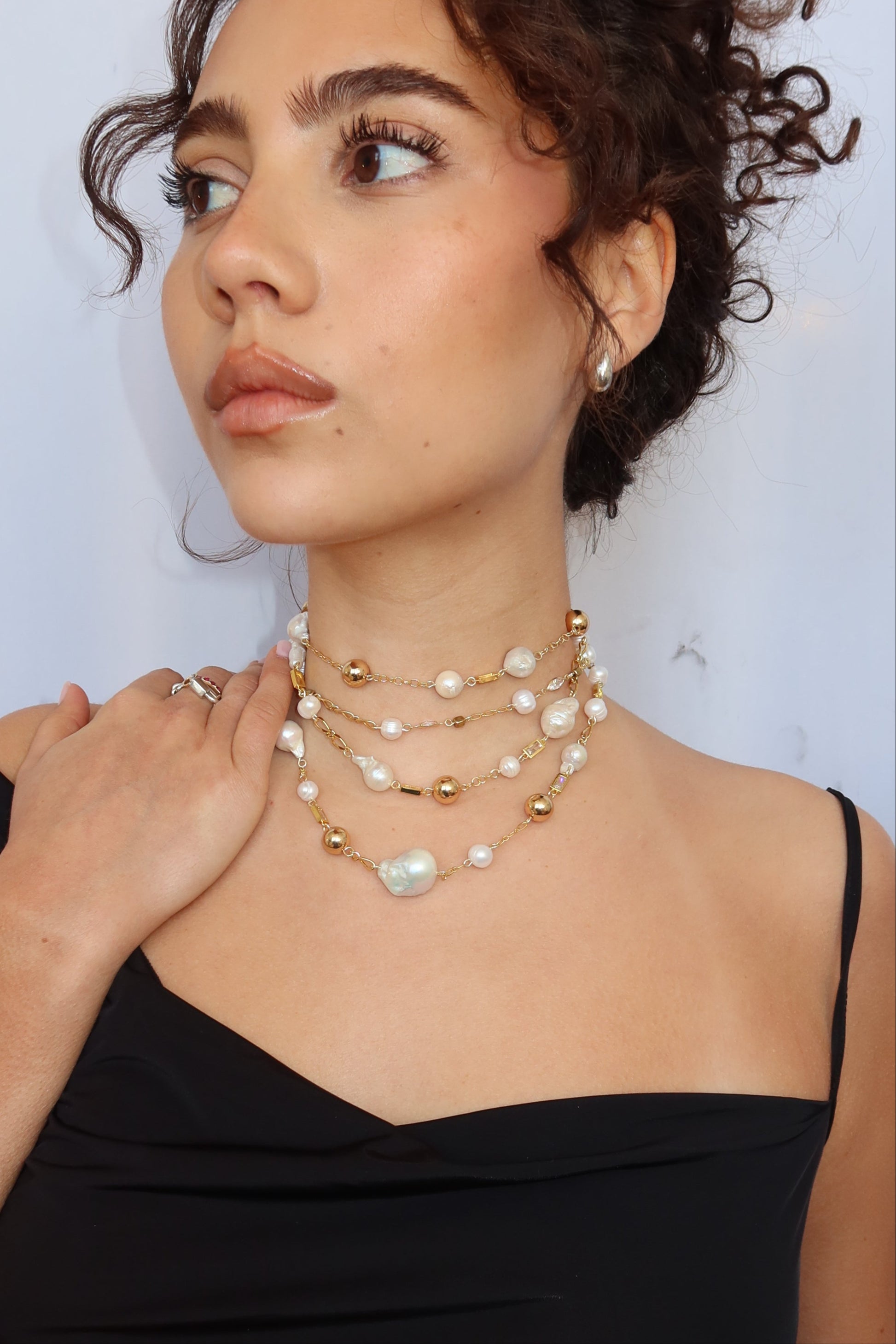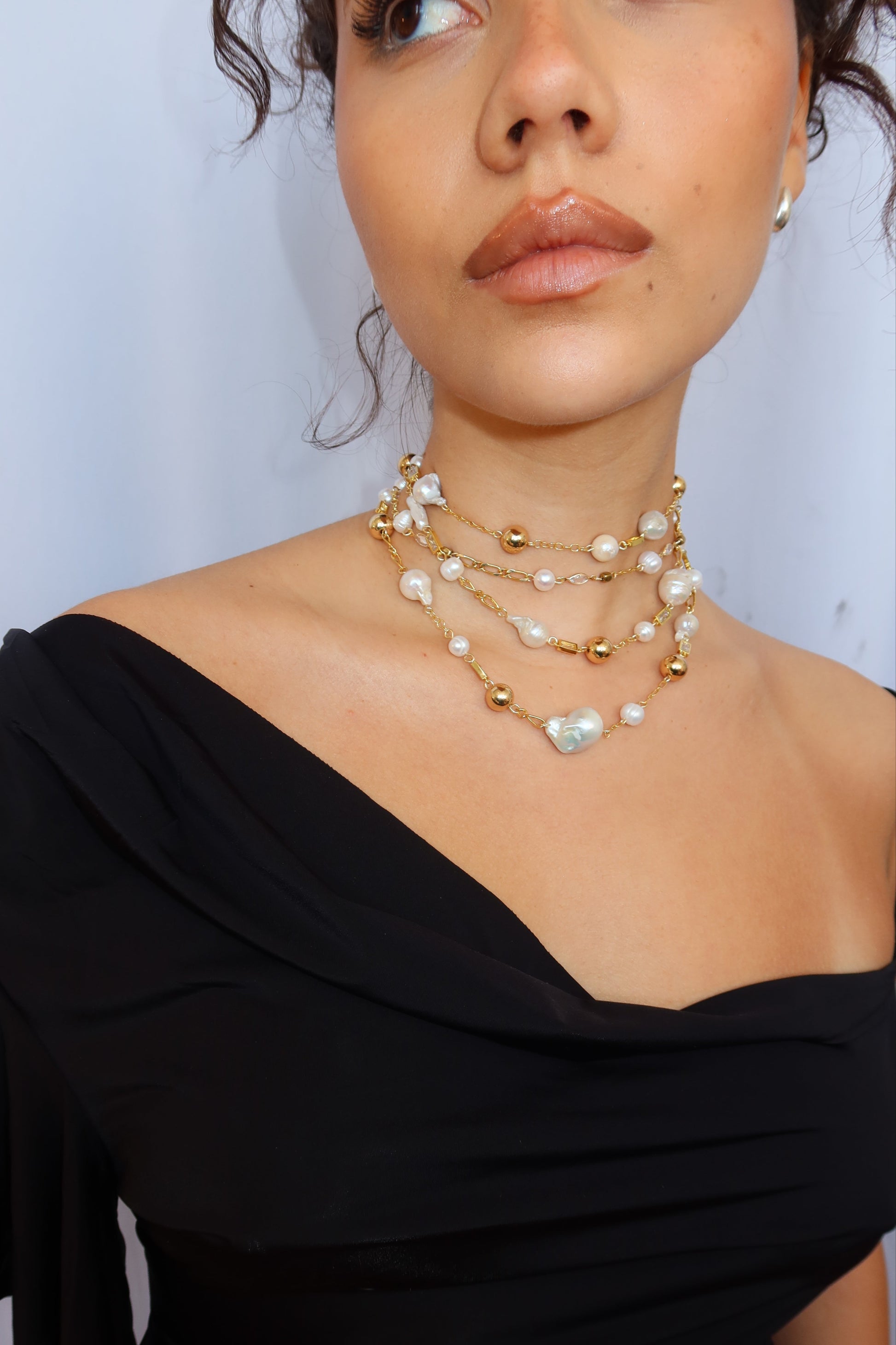 Layered, textured, and effortlessly bold. This triple-wrap necklace weaves together a mix of unique chains and scattered pearls, creating a piece that feels both curated and unrestrained. Versatile in styling, striking in detail—made to be worn your way.