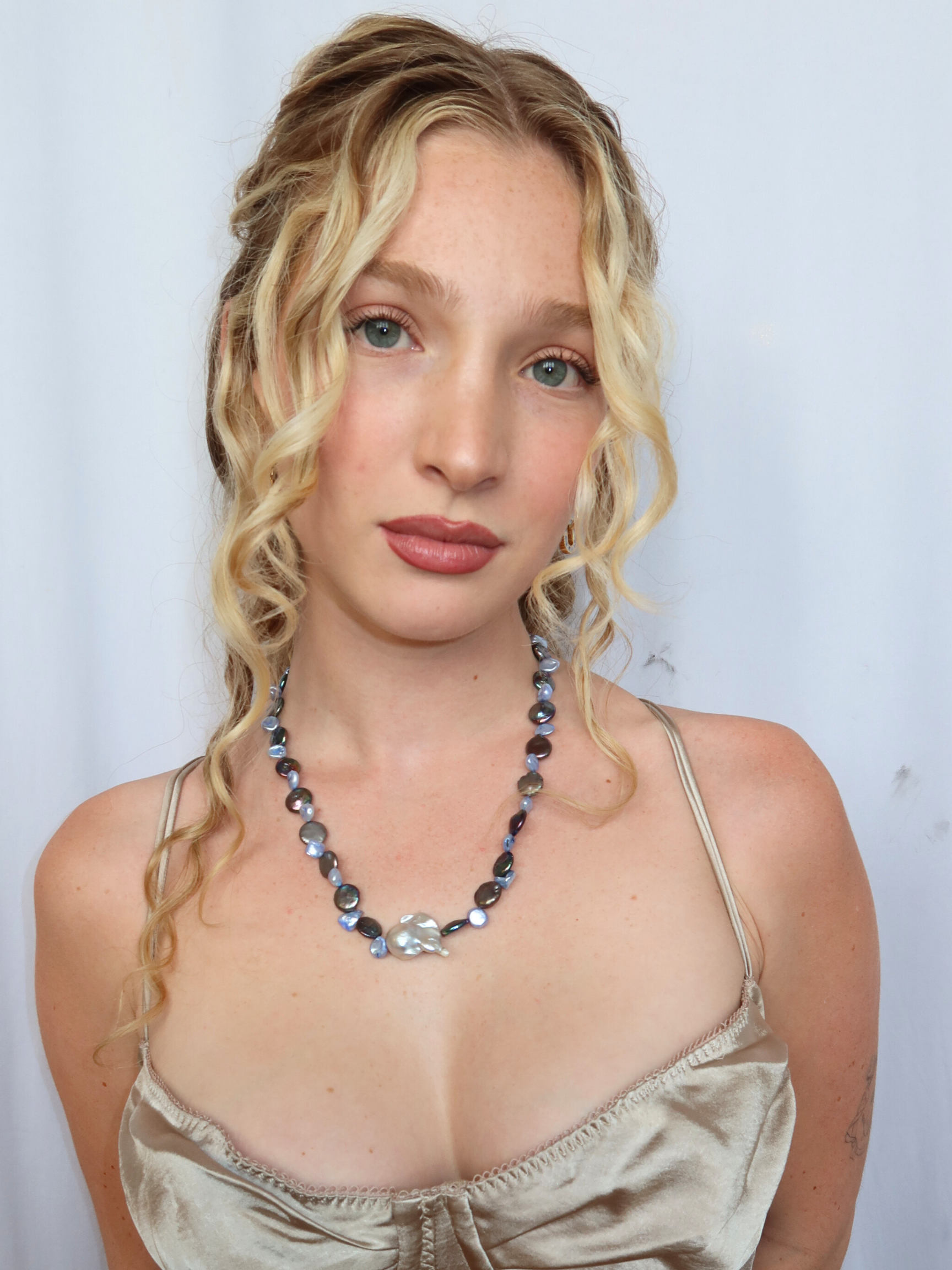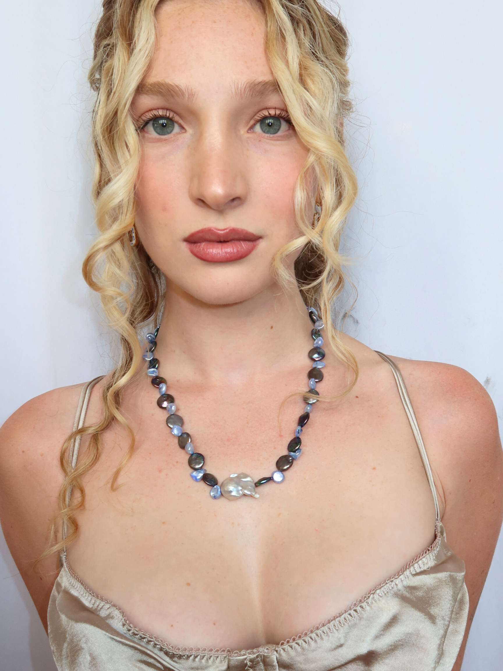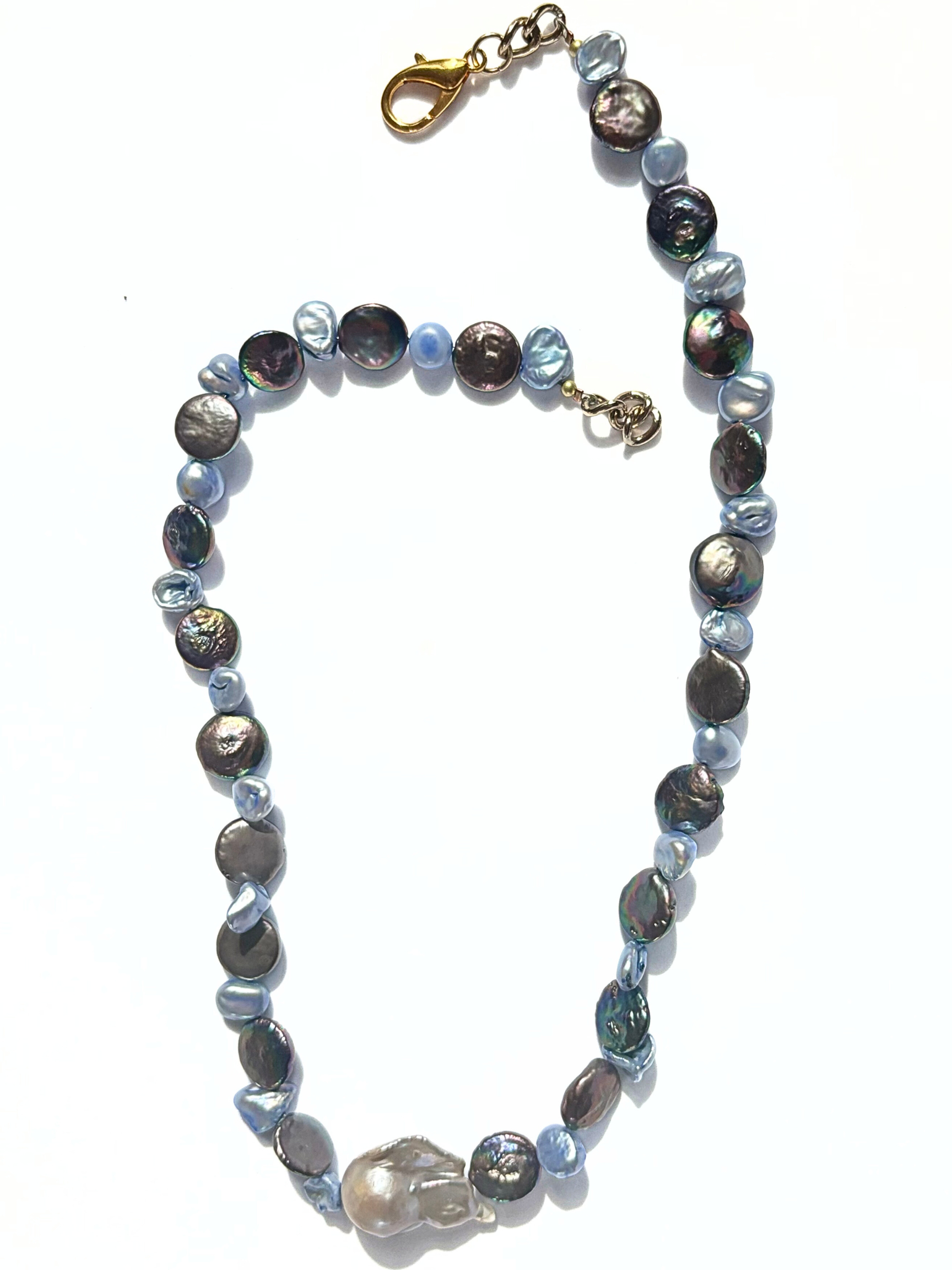Cool-toned elegance with a modern edge. Two shades of blue pearls create soft contrast, leading to a bold, oversized gray pearl pendant. Understated yet striking, this piece blends classic elements with an effortless, contemporary feel.