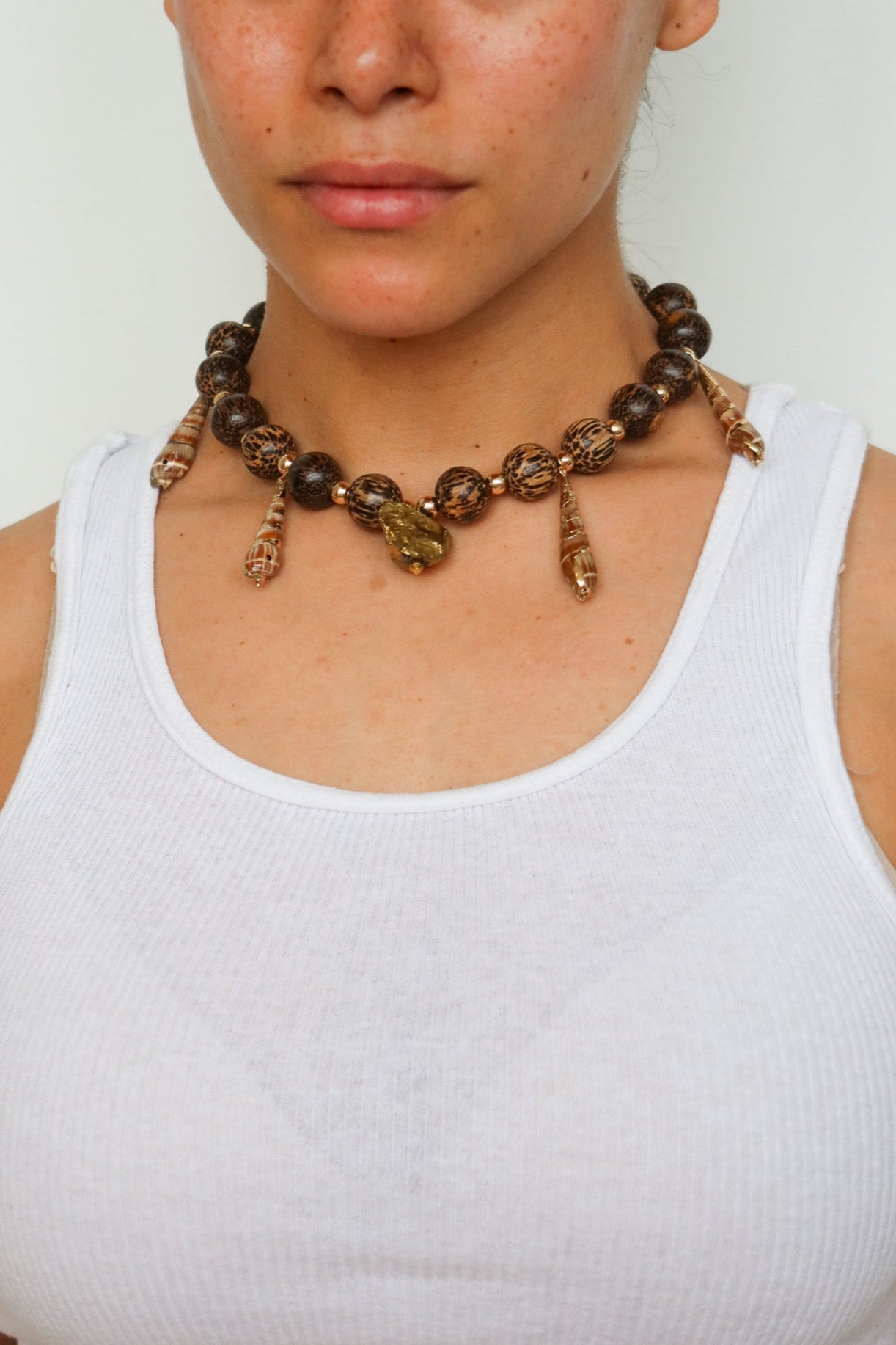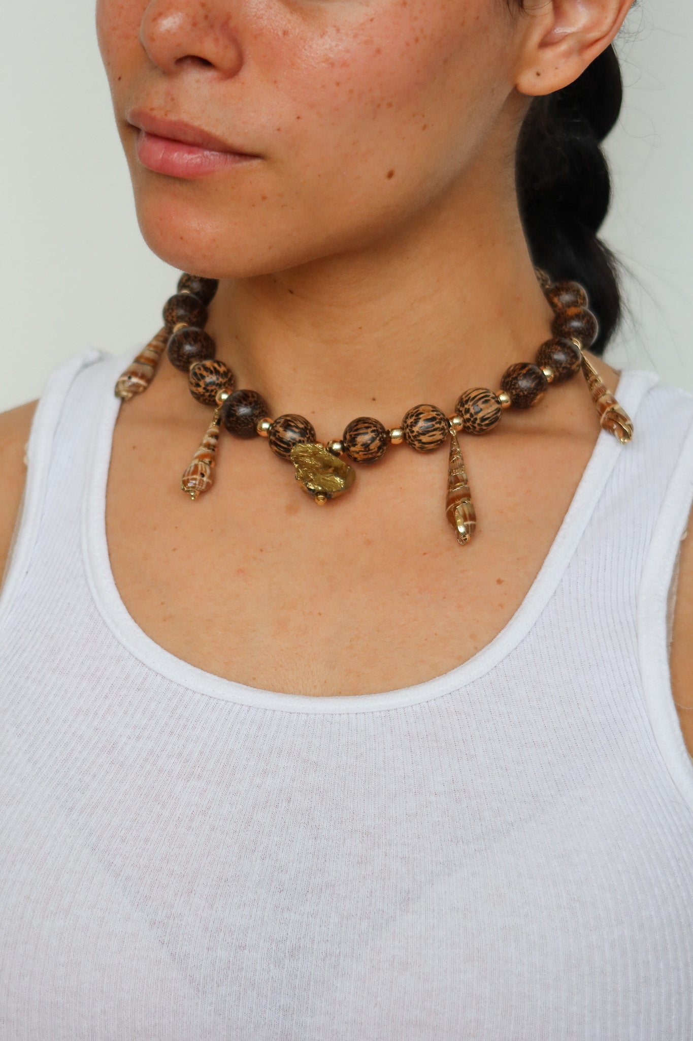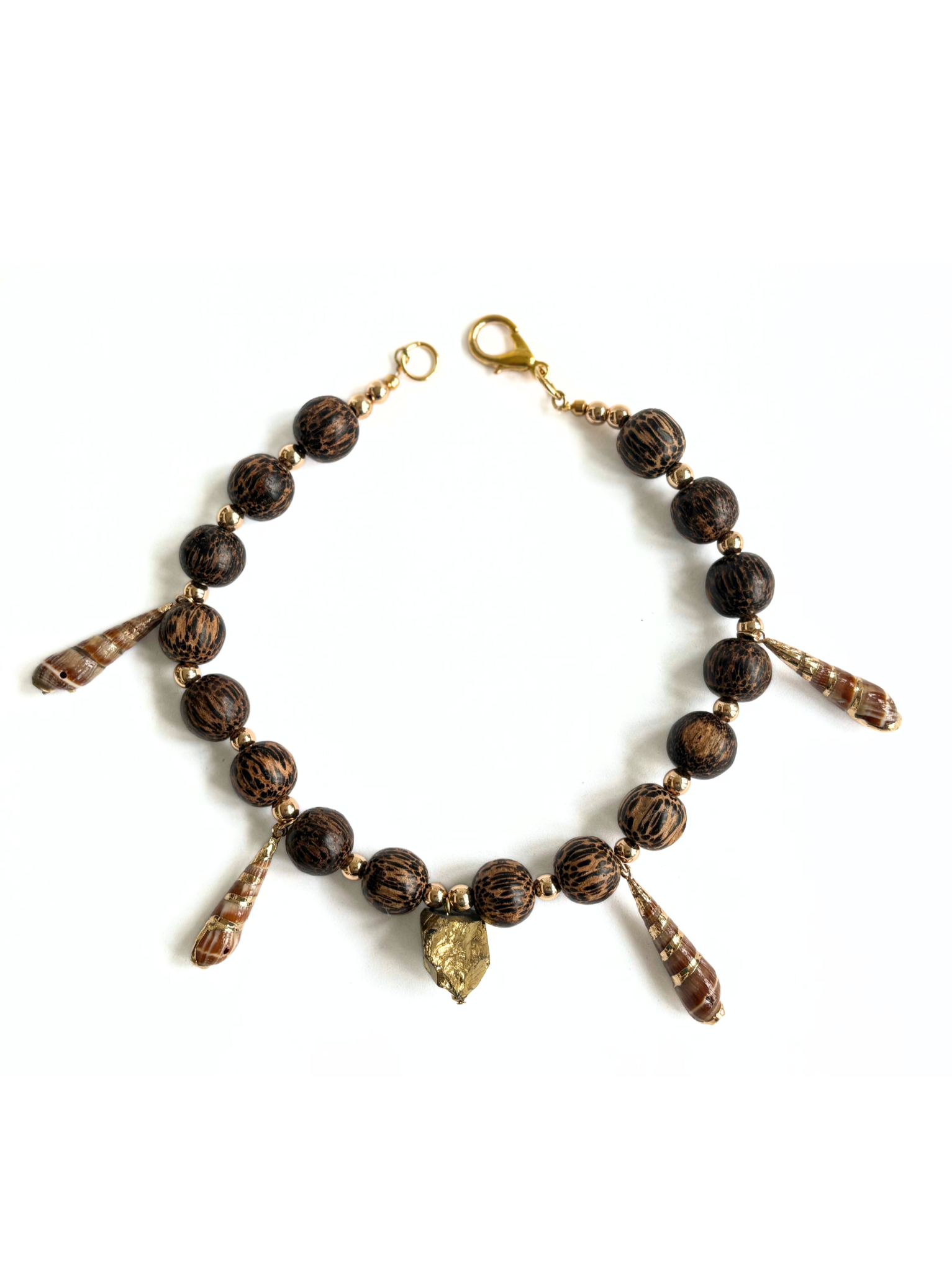 Earthy and bold, this statement necklace features oversized wood beads paired with elongated natural shells that drape from each side, creating movement and contrast. At the center, an irregular gold pendant anchors the piece with warmth and shine. It’s raw elegance with a coastal edge — perfect for sun-drenched days and beyond.