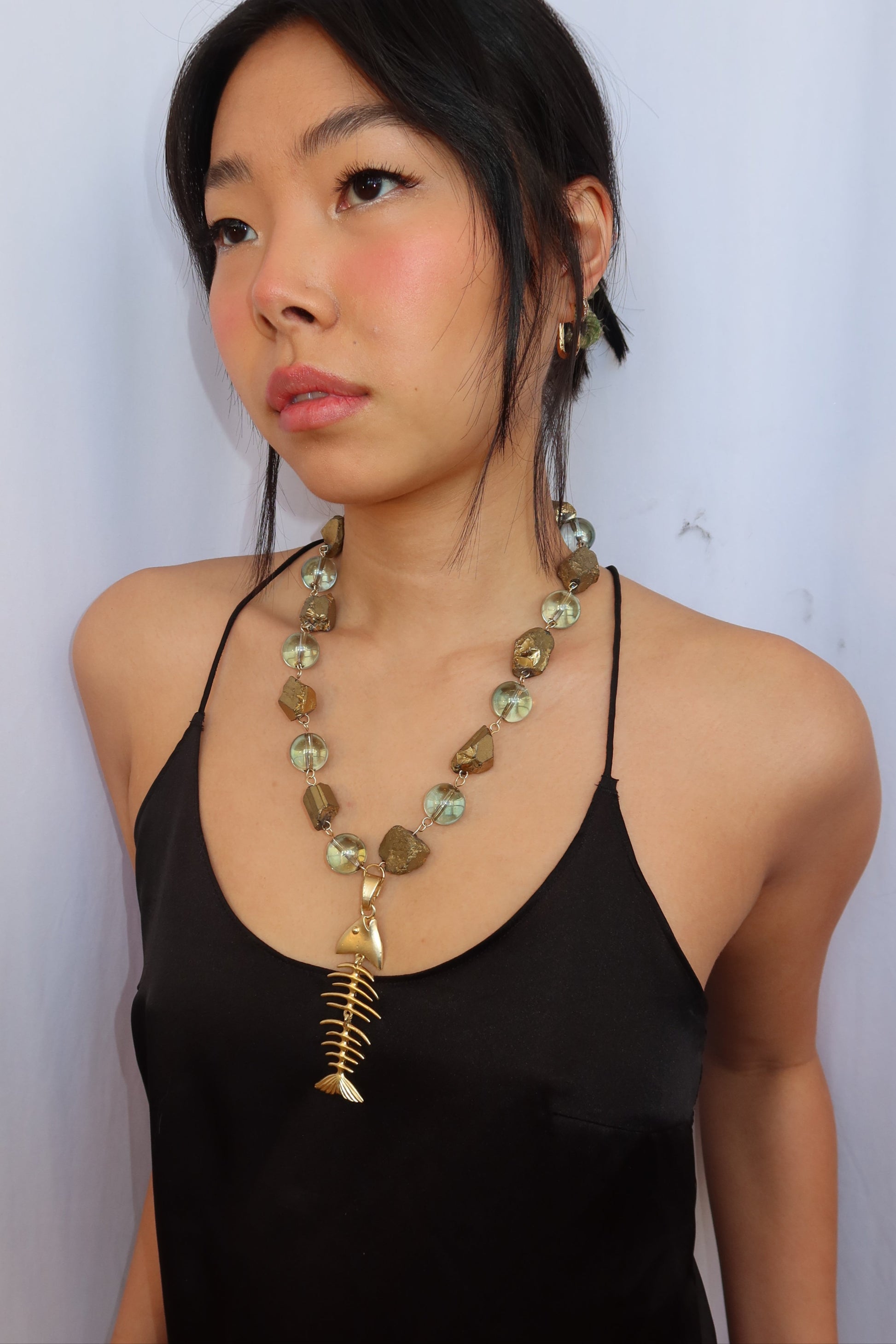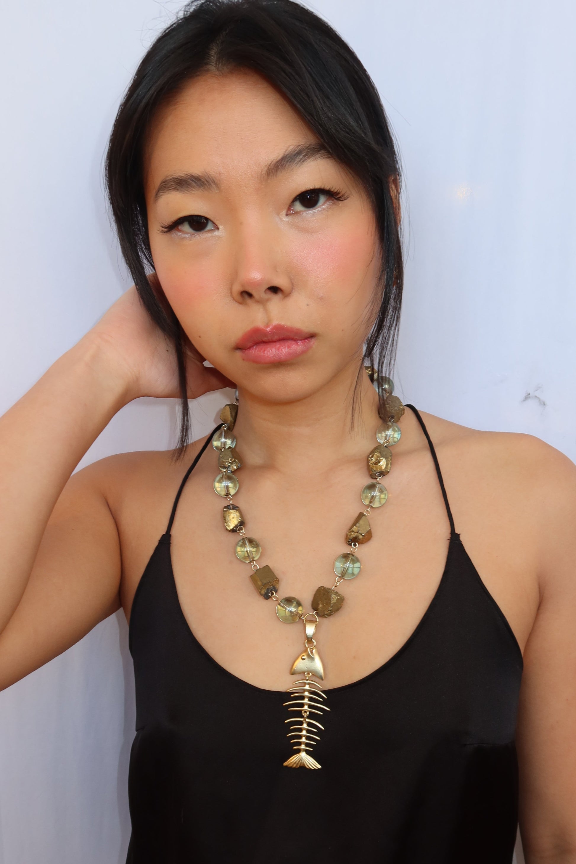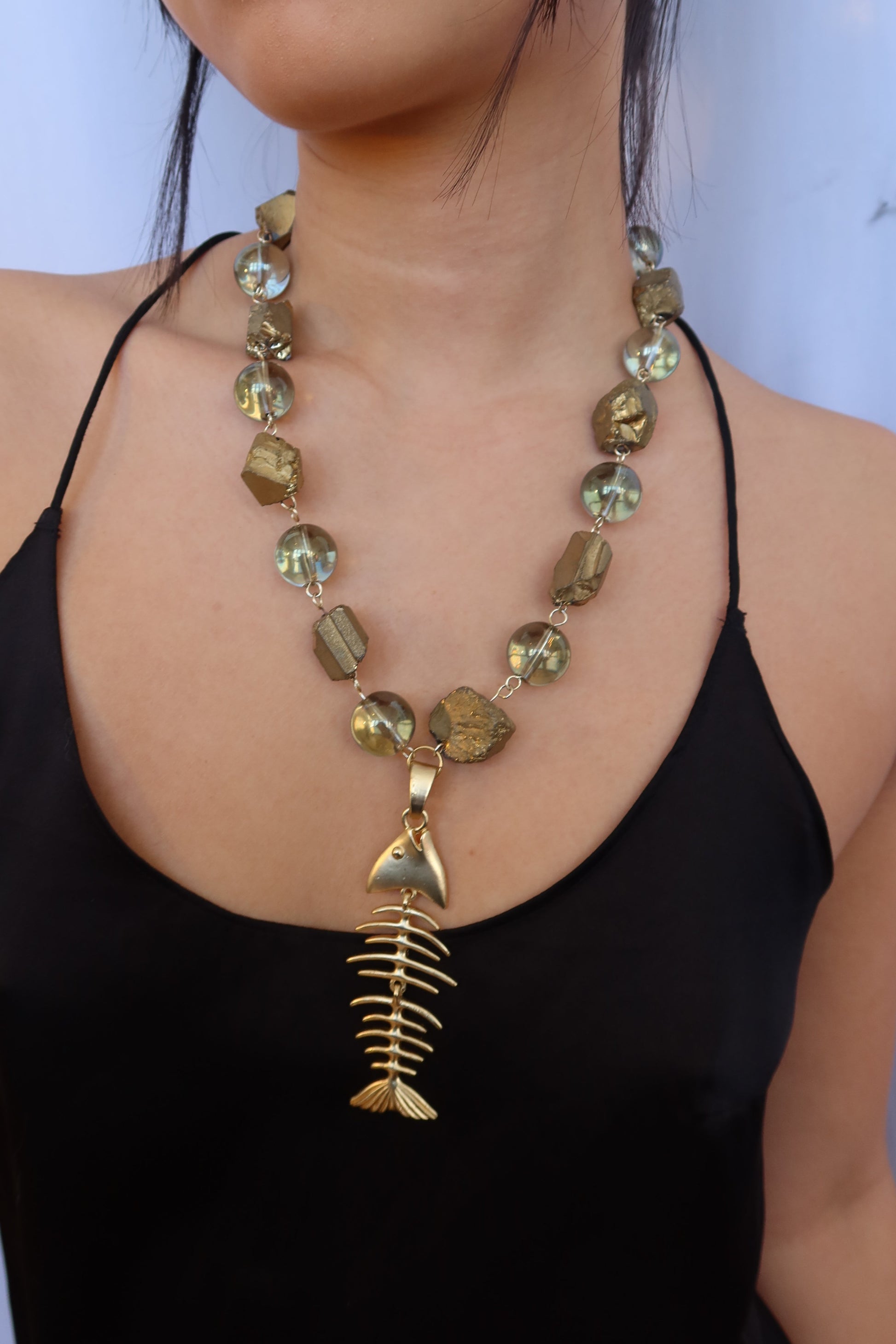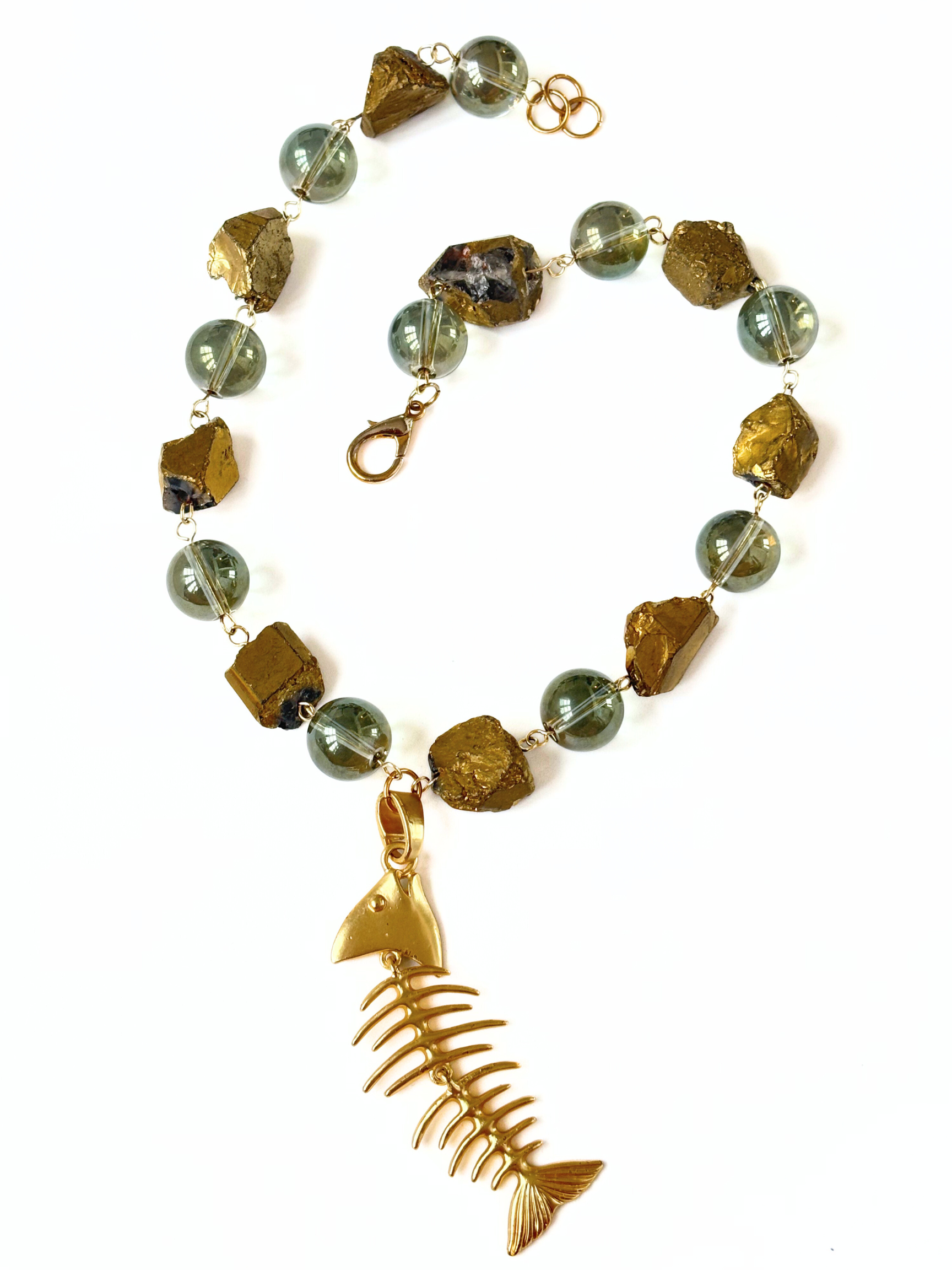 Fluid and bold. Deep blue, mesmerizing circular beads meet organic gold forms, anchored by a gold fish pendant that sways with you. It feels collected, powerful, and effortlessly one of a kind — like something found, not made.
