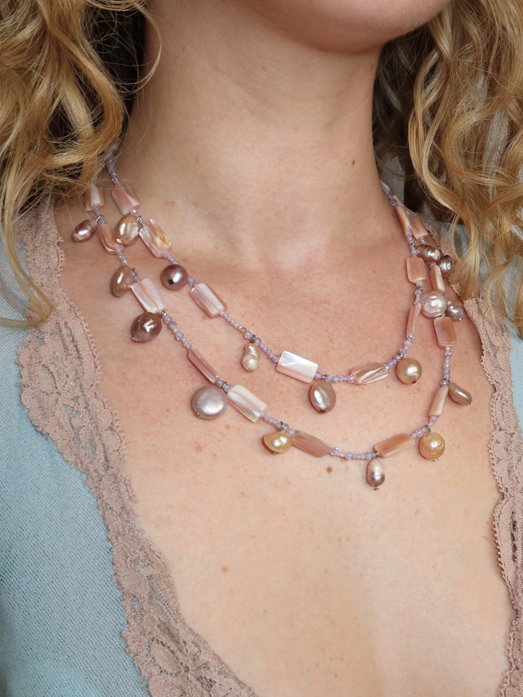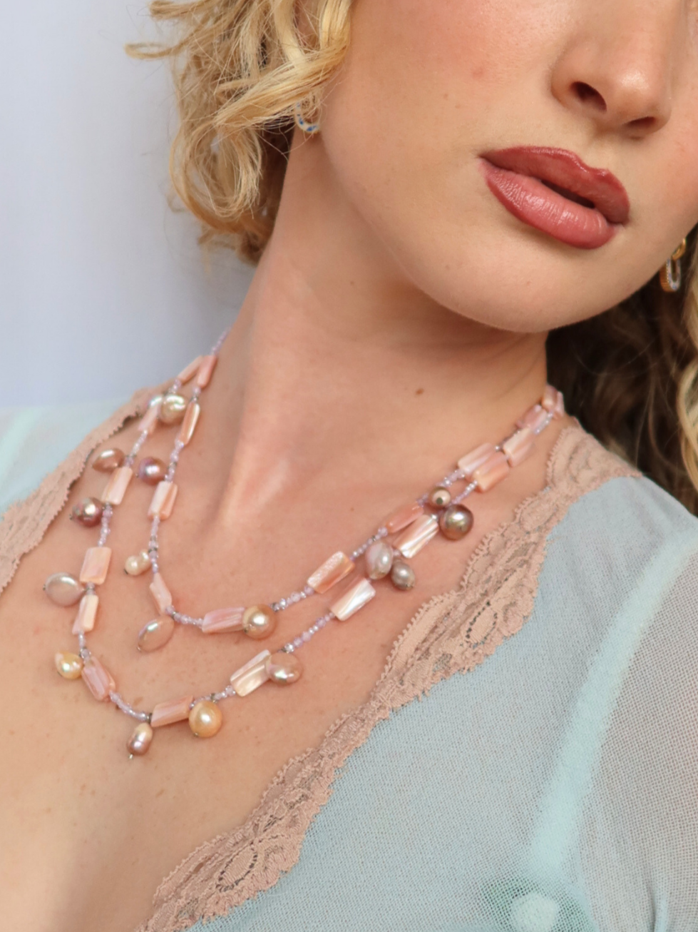 Playful, pretty, and effortlessly cool. Zara layers soft pink and rich purple hues with luminous pink pearls, creating a look that’s both delicate and bold. A fresh take on femininity—fun, vibrant, and impossible to ignore.